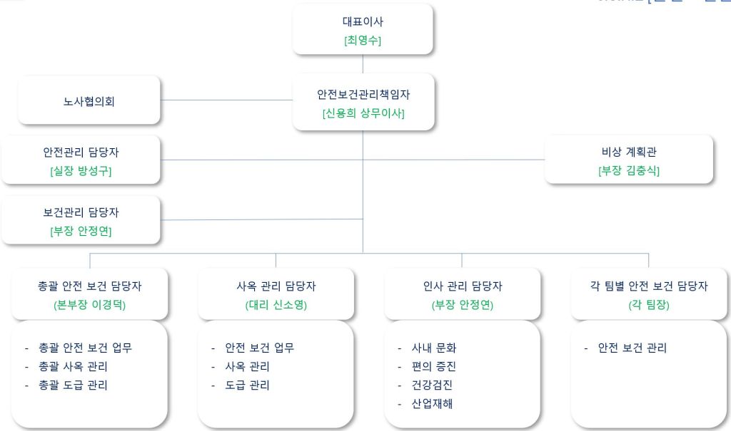 - 모든 임직원 및 이해 관계자의 의사 소통체계를 구축하여 자발적인 참여와 협의를 통해 열려있는 안전보건환경 문화를 정착한다.